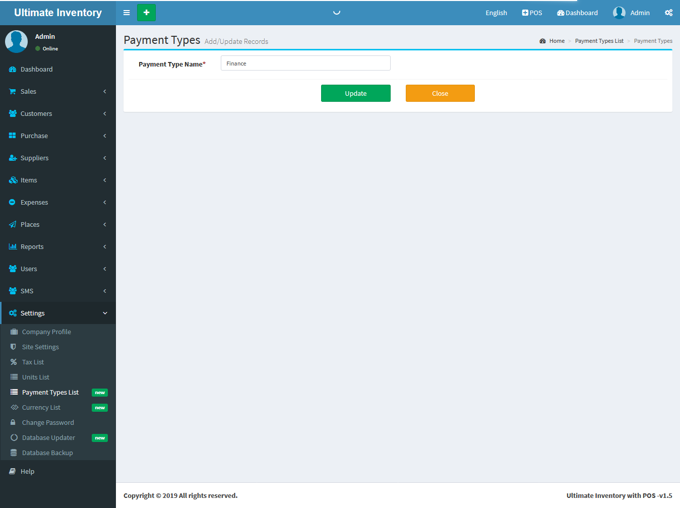 Payment Types Add: Add Payment Type Name