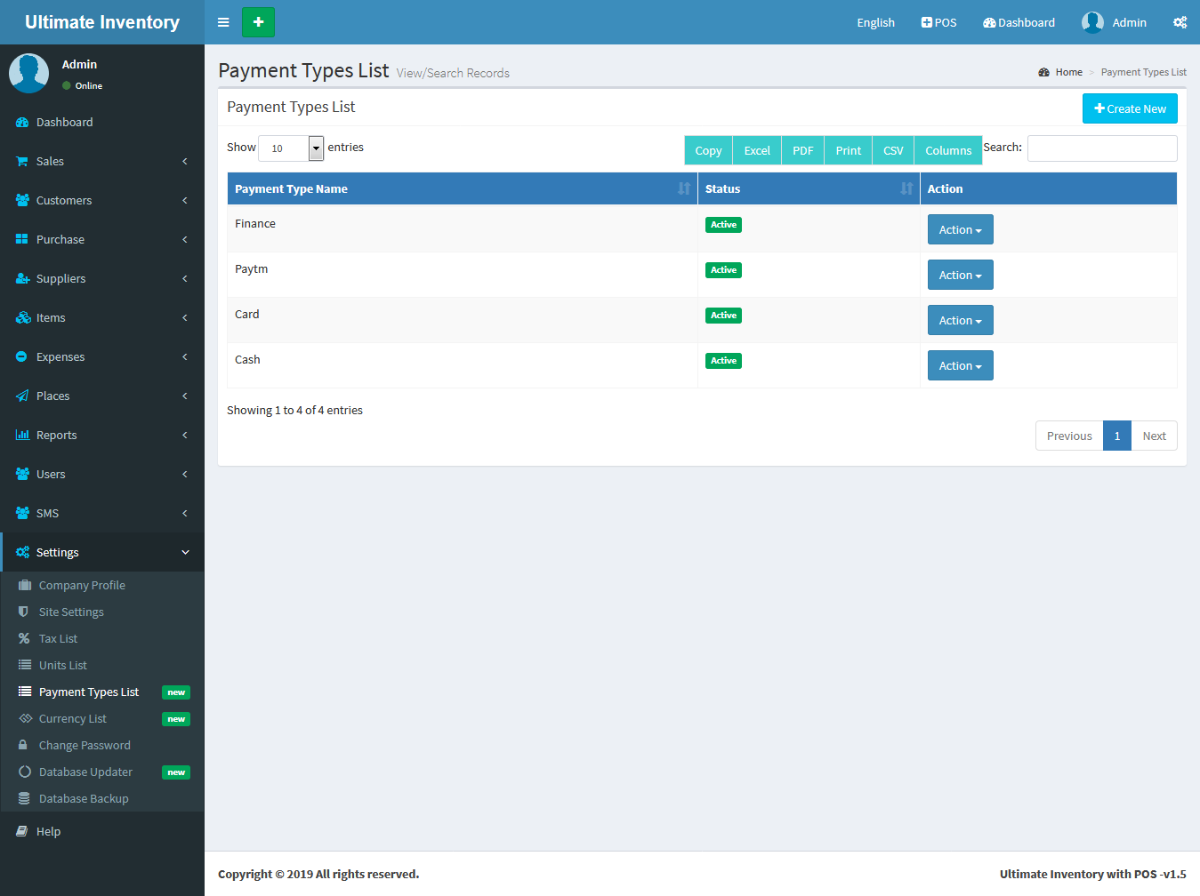 Settings -> Payment Types List