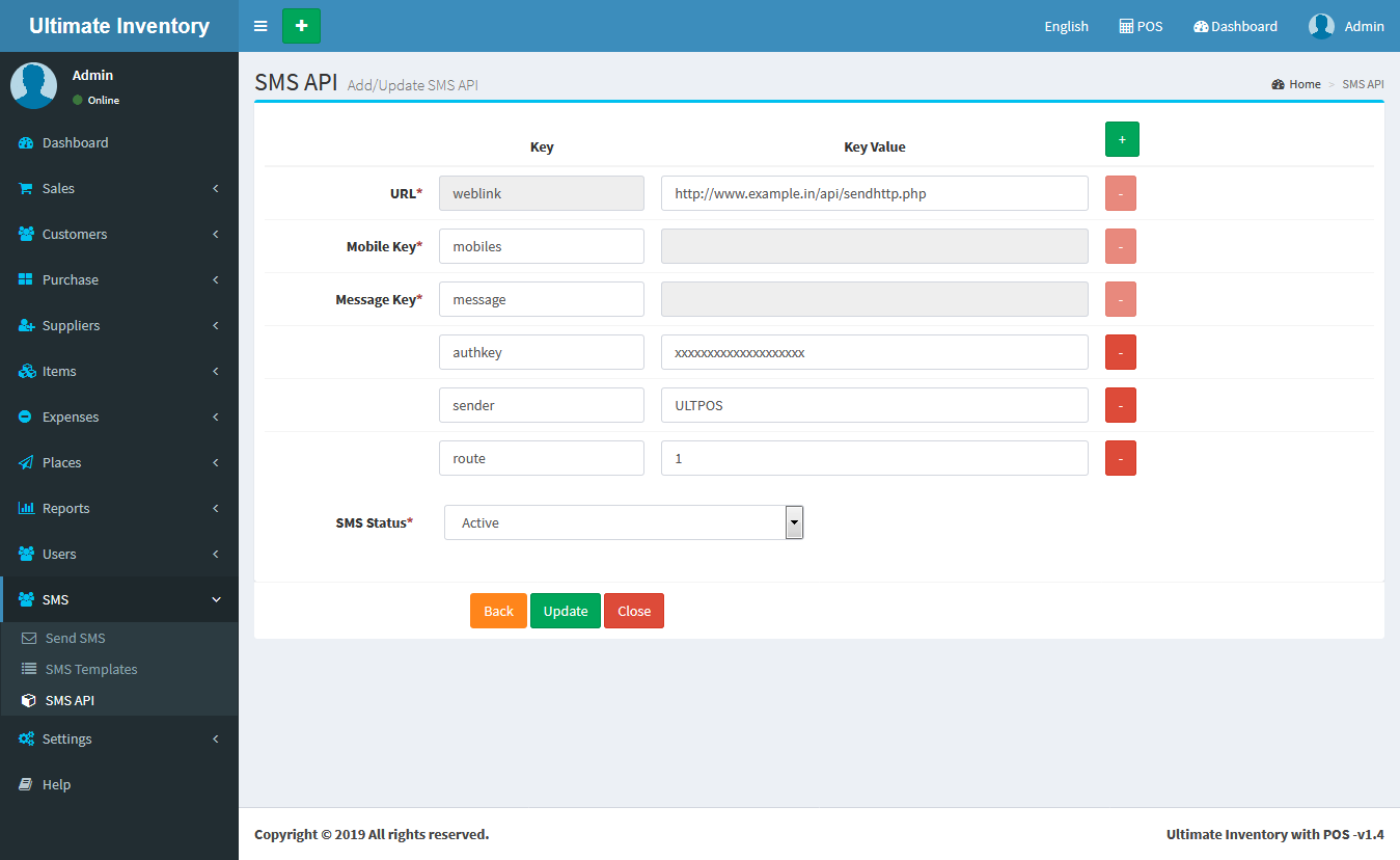 4. After that you can enter other API keys and values linke Auth Key, sender ID, route etc.